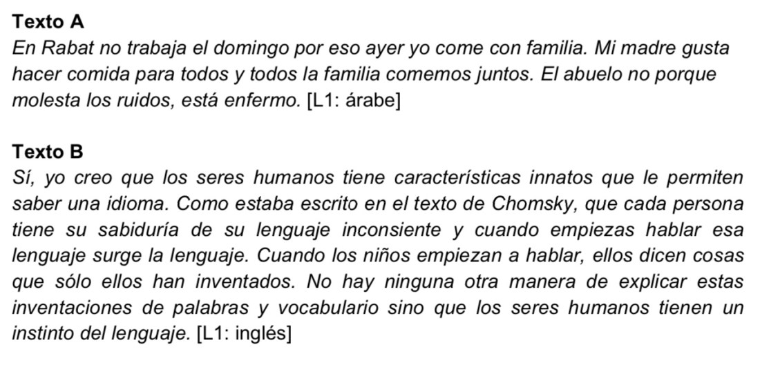 La actividad se realiza en pareja y sirve para justificar la interferencia de la lengua materna en la redacción de cada texto y el proceso de la Interlengua tras los conocimientos adquiridos en la asignatura sobre dichos aspectos.